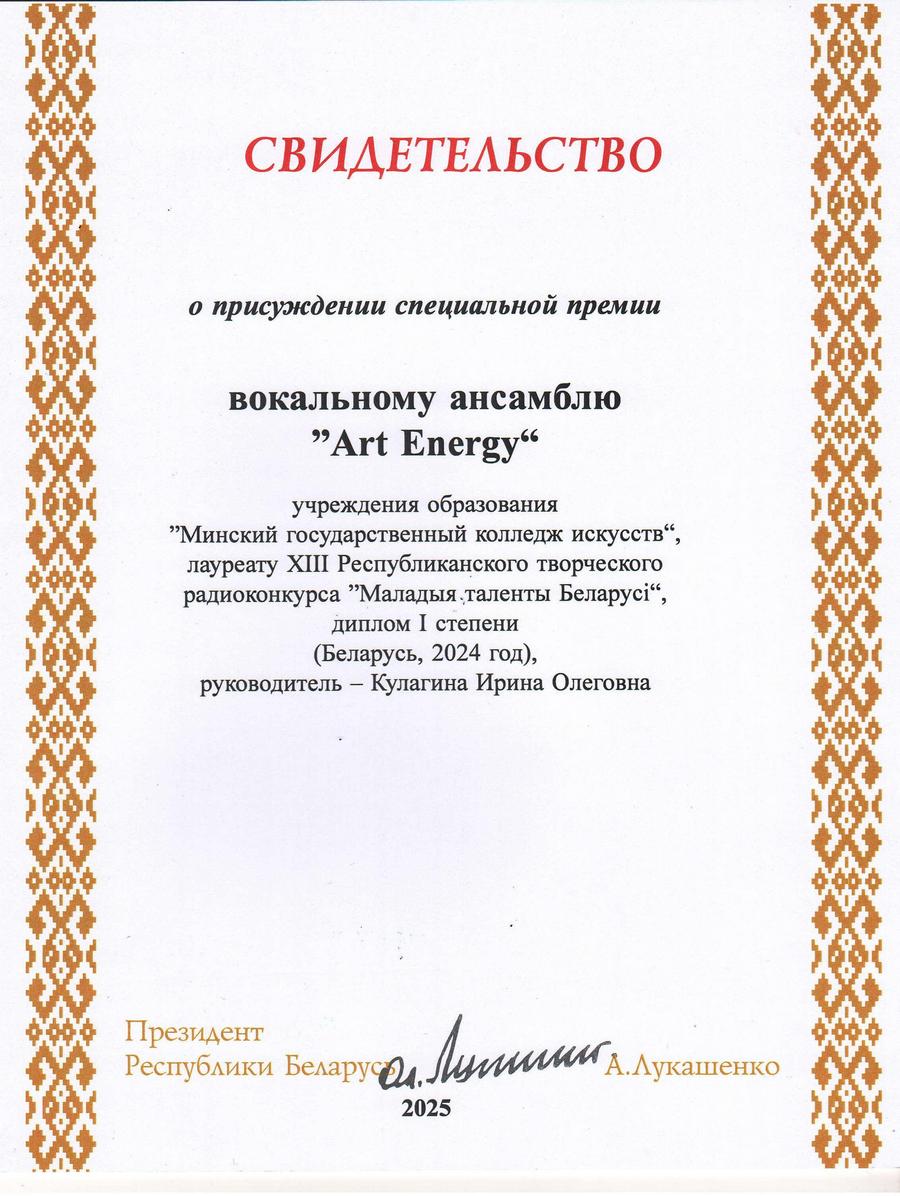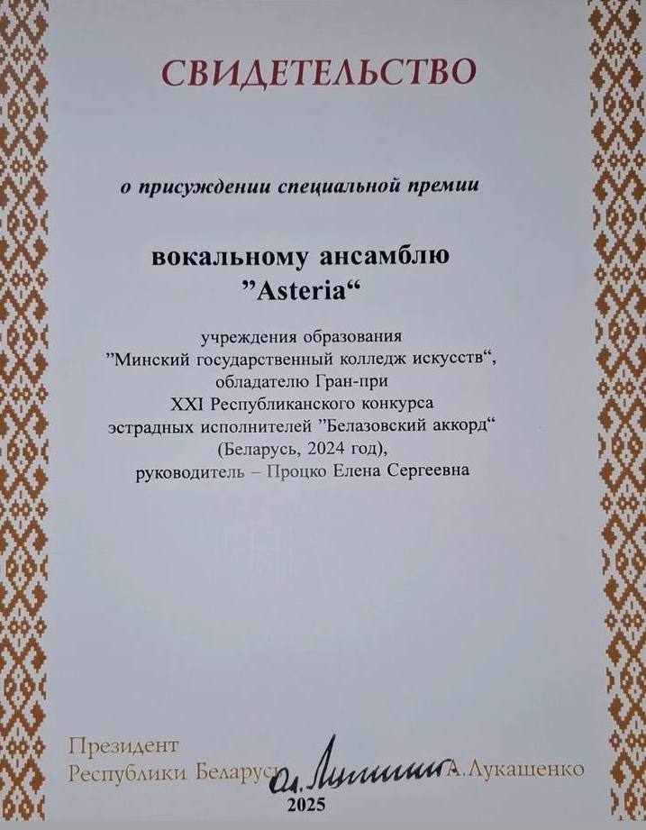 29.10.202529 октября 2025 г. вокальным ансамблям «ART ENERGY» и «ASTERIA» Минского государственного колледжа искусств были вручены свидетельства о присуждении специальных премий специального фонда Президента Республики Беларусь по поддержке талантливой молодёжи.