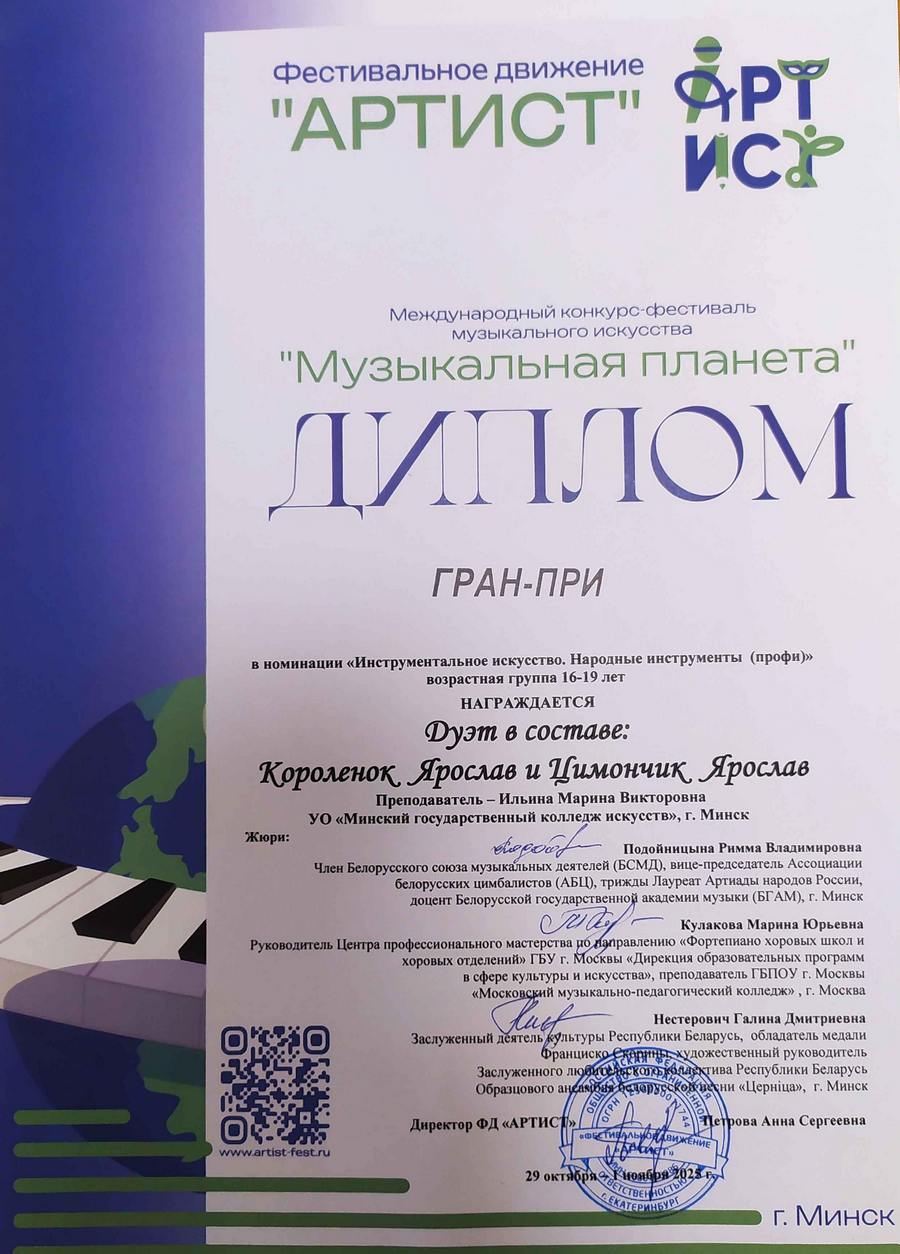 30 октября 2025 года дуэт учащихся специальности «Народное музыкальное художественное творчество (инструментальная музыка)» в составе Ярослава Цимончика (балалайка) и Ярослава Короленка (фортепиано) триумфально выступил на Международном конкурсе-фестивале «Музыкальная планета» (29.10-01.11.2025, г. Минск), завоевав ГРАН-ПРИ в номинации «Инструментальное искусство. Народные инструменты».