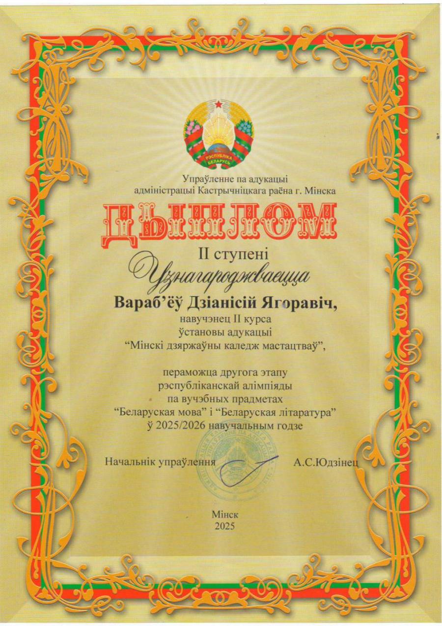 Дзіанісій Вараб’ёў, навучэнец ІІ курса спецыяльнасці “Інструментальнае выканальніцтва (інструменты народнага аркестра)”, узнагароджаны Дыпломам ІІ ступені па выніках другога этапу рэспубліканскай алімпіяды па вучэбных прадметах “Беларуская мова” і “Беларуская літаратура” ў 2025/2026 навучальным годзе.