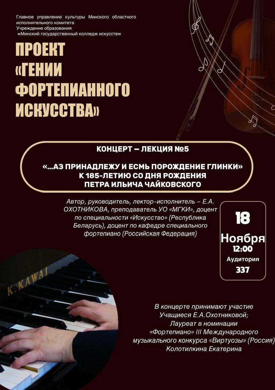 18 ноября 2025 г. в рамках модуля «Гении…» в камерном зале колледжа был представлен полуторачасовой концерт-лекция «…Аз принадлежу и есмь продолжение Глинки». Программа приурочена к 185-летию со дня рождения П.И.Чайковского – гениального русского музыканта, разносторонняя деятельность которого способствовала формированию единой национальной композиторской школы, истоки которой – в творчестве М.И.Глинки (вспомним меткое выражение самого Петра Ильича о русской симфонической музыке, которая вся вышла из «Камаринской» Глинки подобно дубу из жёлудя).