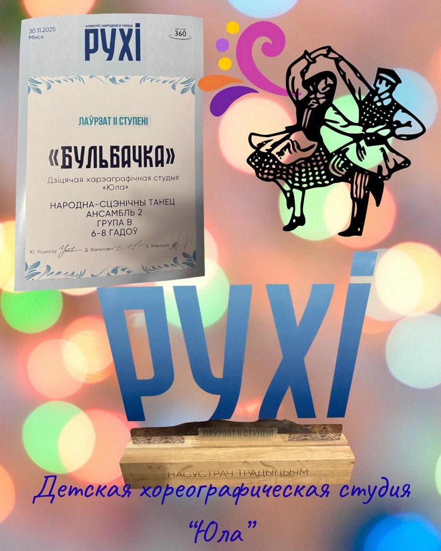 30.11.2025 – детская хореографическая студия «Юла» (младшая группа) стала ЛАУРЕАТОМ II степени в конкурсе народного танца «Рухі» (г.Минск) за хореографический номер «Бульбачка».