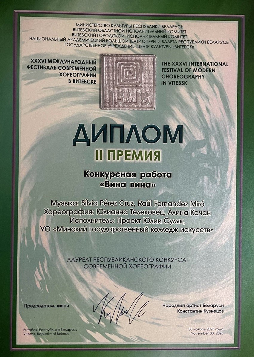 ЛауреатаII премии республиканского конкурса современной хореографии в рамках XXXVI Международного фестиваля современной хореографии в Витебске IFMC (конкурсная работа «ВИНА ВИНА» хореография: Юлианна Телековец, Алина Качан преподаватель Суляк Ю.А.)