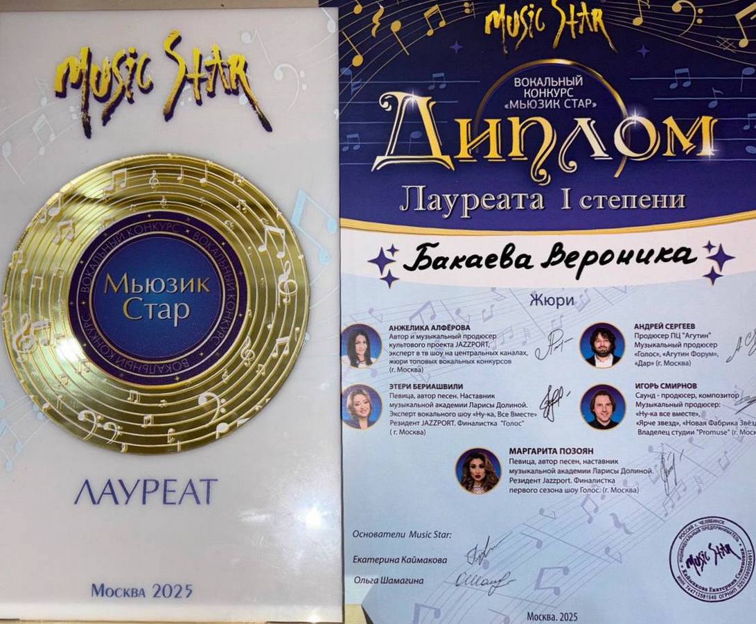 ВероникуБАКАЕВУ, чащуюся III курса специальности «Искусство эстрады (пение)» (преподаватель Мирончук О.И.), с триумфом в международном вокальном конкурсе «MUSIC STAR» (9 декабря 2025, г.Москва, РФ)
