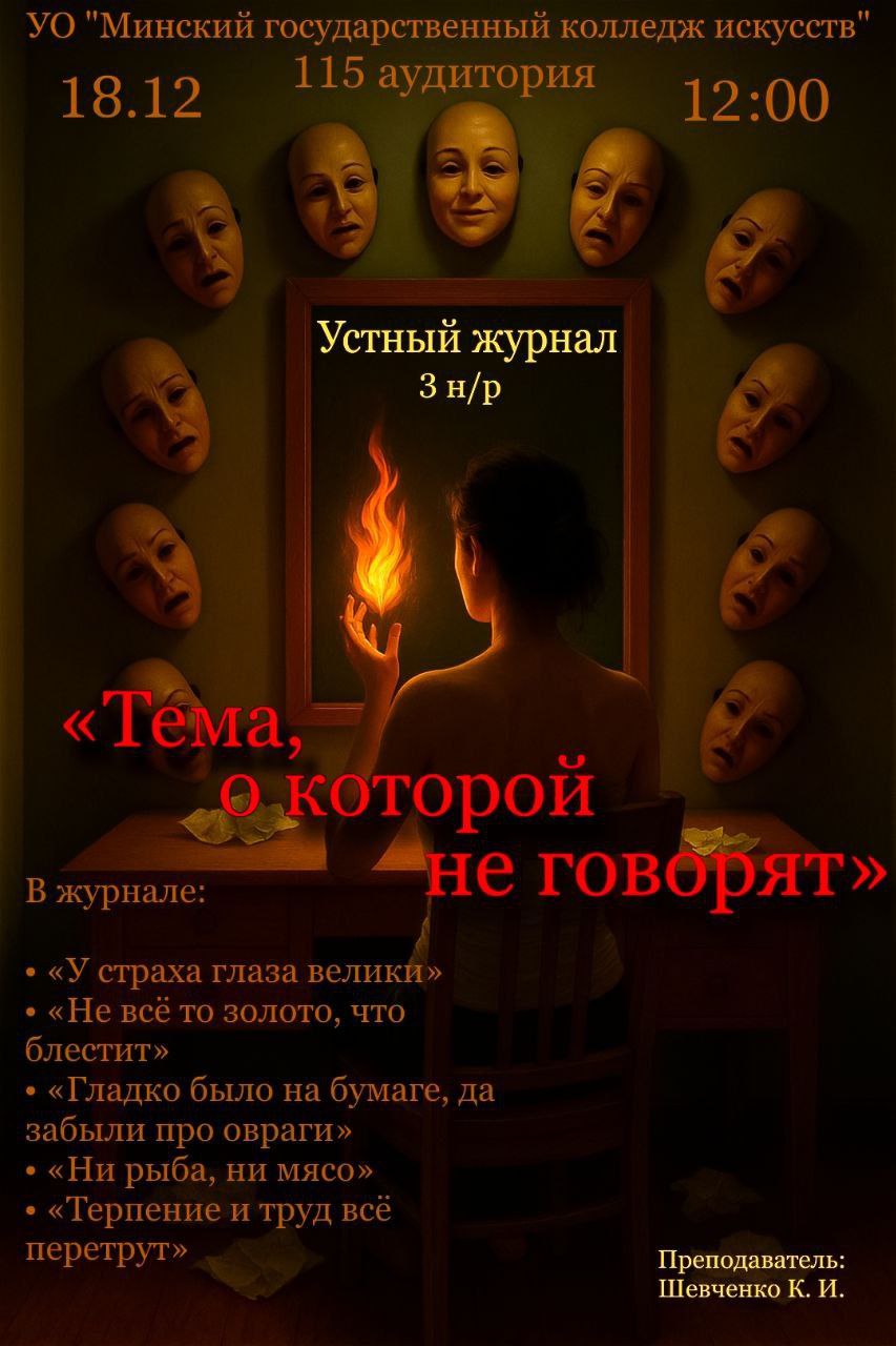 19.12.2025В декабре 2025 г. на цикловой комиссии «Социально-культурная и досуговая деятельность» состоялось 2 устных журнала на актуальные для современной молодежи темы. Оба мероприятия были реализованы в рамках долгосрочного проекта «Не могу молчать!».