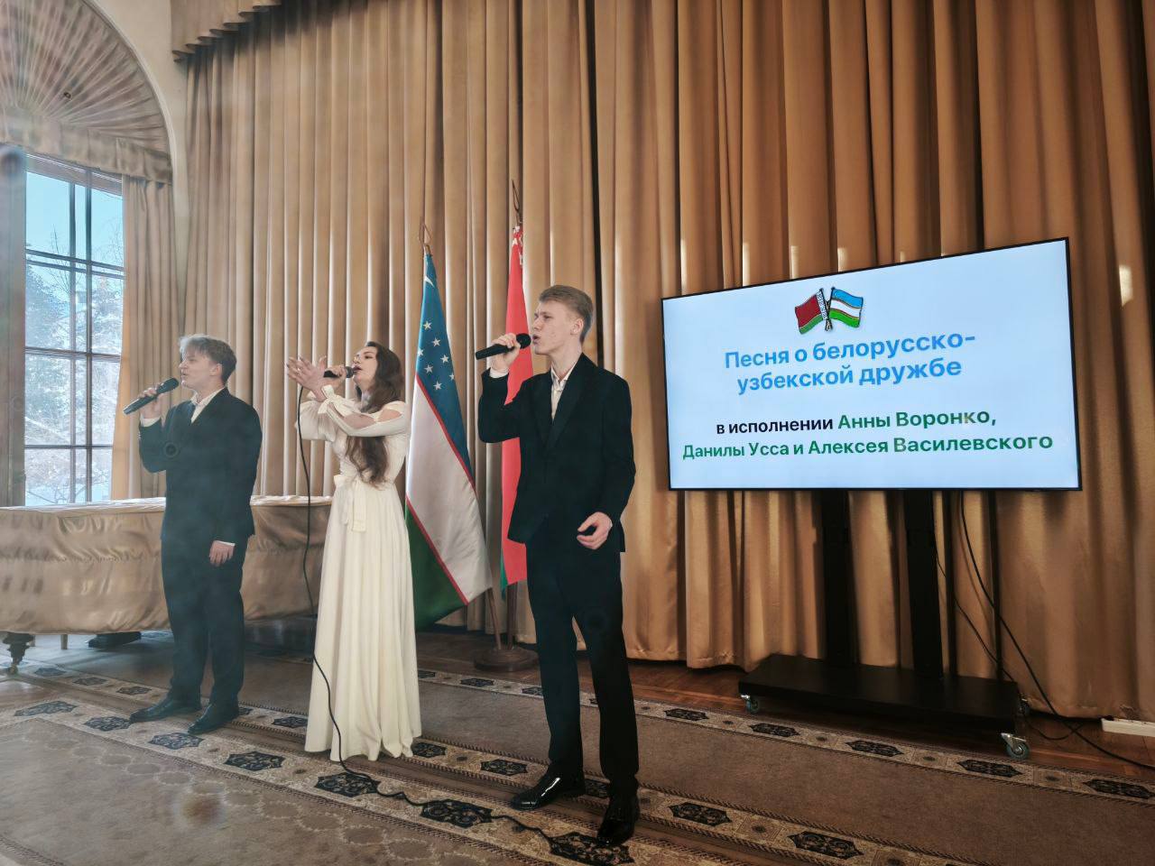 В торжестве приняли участие учащиеся специальности «Искусство эстрады (пение)» Данила Усс, Анна Воронко и Алексей Василевский – ребята открыли вечер песней «Узбекистан и Беларусь» Е.Атрашкевич на слова Л.Войновой.