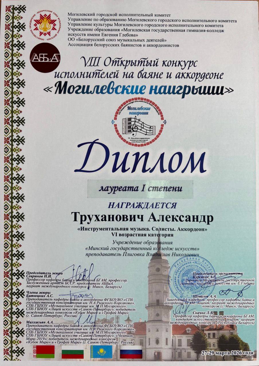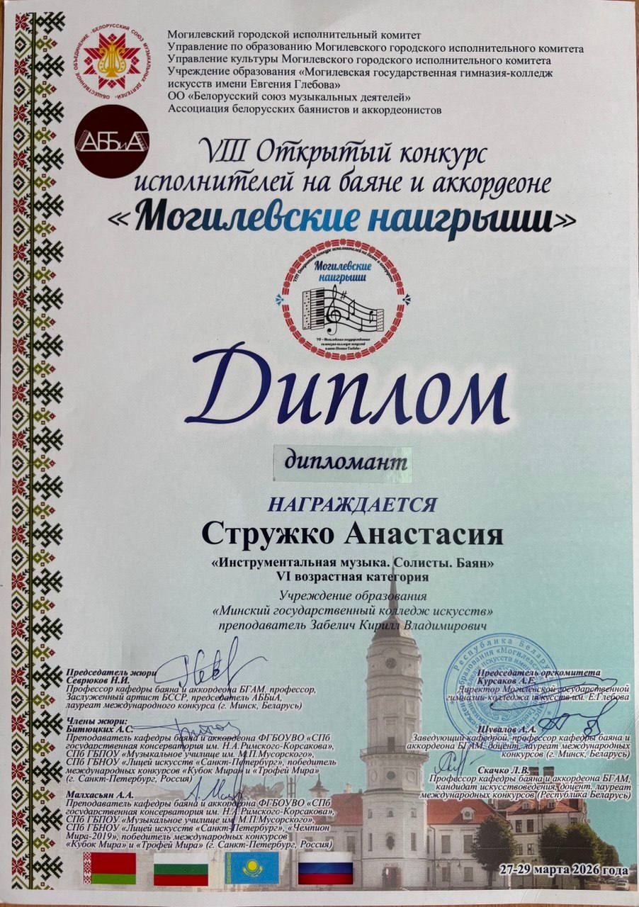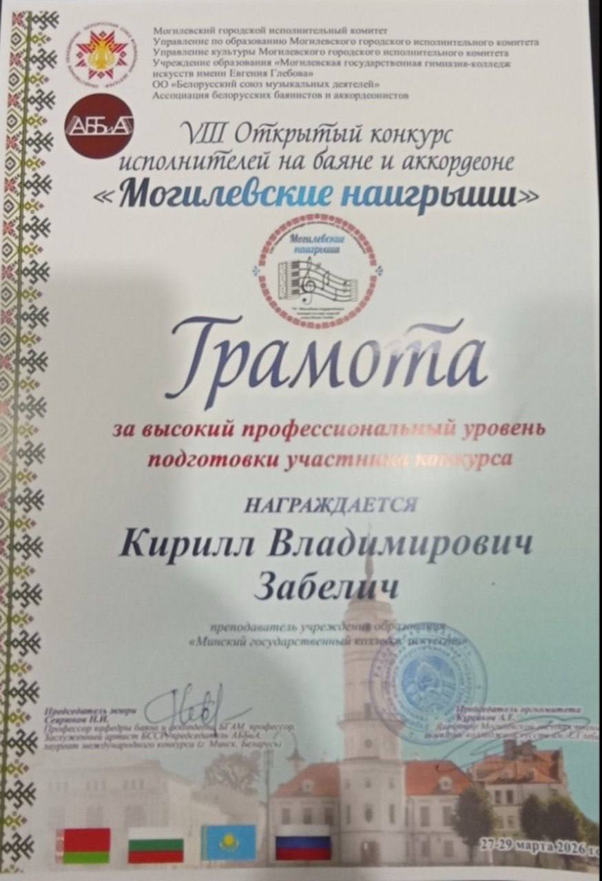 Учащиеся получили приглашение принять участие в концерте Молодежного оркестра баянистов и аккордеонистов Республики Беларусь (г. Минск; худ. рук. и дирижёр Александр Шатов). Концерт состоялся 28 марта 2026 г. в рамках Фестиваля баянного и аккордеонного искусства «Дни Могилевского баяна и аккордеона» в Концертном зале Могилевской государственной гимназии-колледжа искусств имени Евгения Глебова.
