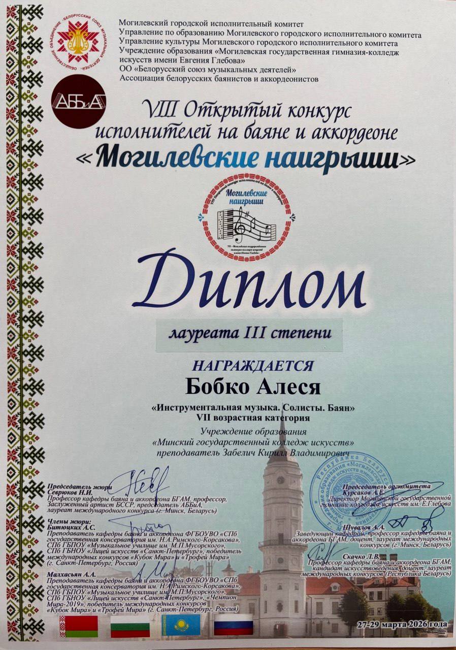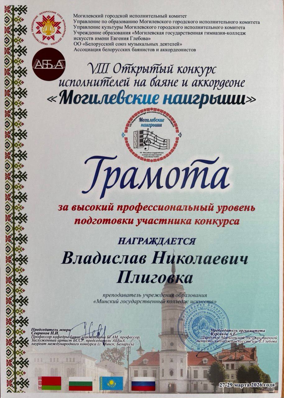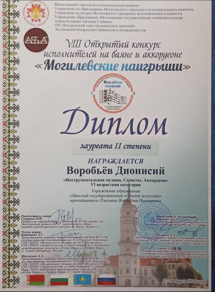 Учащиеся получили приглашение принять участие в концерте Молодежного оркестра баянистов и аккордеонистов Республики Беларусь (г. Минск; худ. рук. и дирижёр Александр Шатов). Концерт состоялся 28 марта 2026 г. в рамках Фестиваля баянного и аккордеонного искусства «Дни Могилевского баяна и аккордеона» в Концертном зале Могилевской государственной гимназии-колледжа искусств имени Евгения Глебова.