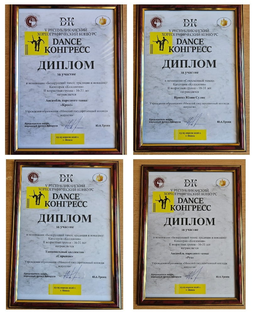 В номинации «Белорусский танец: традиция и новация» конкурса (в категории «Коллектив») приняли участие также наши учащиеся IV курса – танцевальный коллектив «Спрынак» (преподаватель Криштов Д.А.) и ансамбль народного танца «Рух» (преподаватель Бондаревская М.А.).